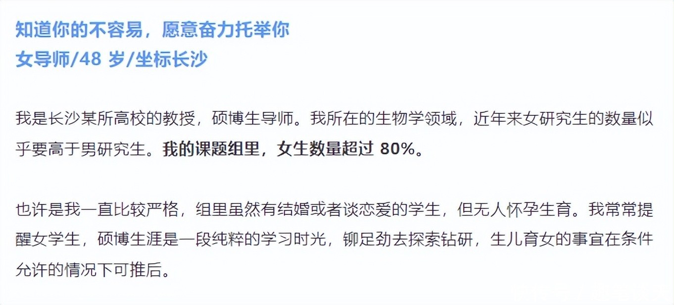 导师说自己32岁生的孩子,这些症状跟自己当初怀孕很类似,“我将她单独叫到办公室,问她是不是怀孕了,她承认后,痛哭流涕,这也确认了她确实怀孕的事实,在她情绪稳定后,我先恭喜了她怀孕,跟她探讨了一下如何完成学业。那天她说了很多自己的私生活,但是科研是科研,生活是生活。”